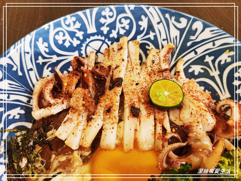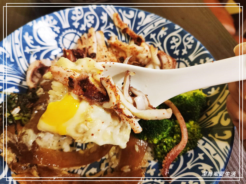 果然配料都把白飯蓋滿滿的😆,有健康花椰菜/甜軟洋蔥/半熟蛋/海苔絲,還有重點主食的澎湖中卷。