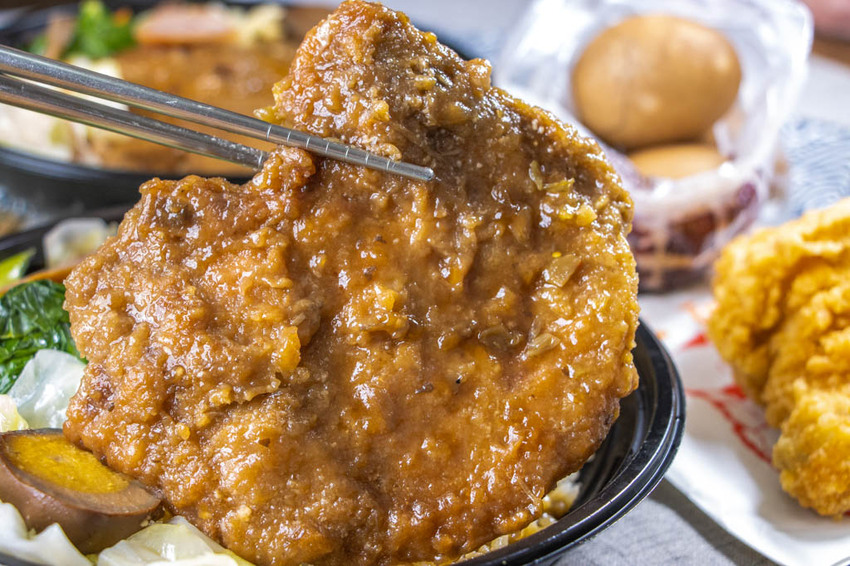 先炸後滷的排骨則是香氣四溢,看上去就油亮油亮,夾的時候就能感受到肉質偏軟些。