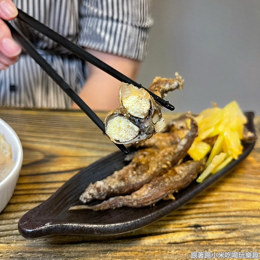 炸魚兒(炸喜相逢)85元,這個小米蠻推的說,有鹹香鮮味的魚卵及魚肉的口感,魚刺是軟軟的直接吃就可以了~