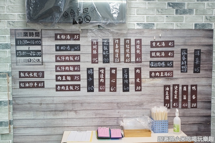 來看一下菜單吧,主食是米粉湯.水餃.瓜仔肉飯麵及赤肉羹飯麵等,其他就是小菜類,小菜有燙的也有炸的,小心手滑呀