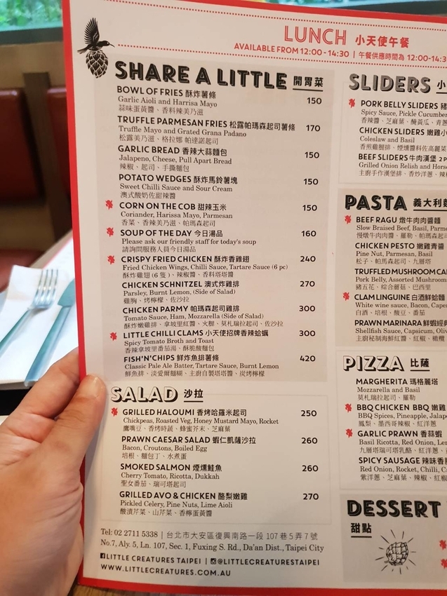 小天使白天有販賣早午餐/義大利麵/比薩/小漢堡/薯條/甜點/各類飲品/啤酒全天候供應!