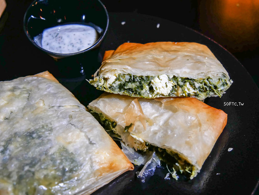 這是當天晚上全桌喜歡的菜排名第二XD菠菜派裡頭以菠菜和羊奶酪為餡料,再加上費塔乳酪起司、帕瑪森起司等多種乳酪,外頭的派皮(Phyllo)可不是一般簡單的酥皮而已,而是薄得酥脆薄得透亮,咬起來卡茲卡滋作響,不會有酥皮過於厚實的膩口,或是咬一口就像仙女散花那樣皮灑落一地,菠菜派的外皮(Phyllo)可是像一個正方形的盒子一樣緊緊包裹住餡料,很像好幾層炸春捲皮疊在一起但是完全不油膩,裡頭一絲絲菠菜潤口完全沒有破壞外皮的脆,反而跟各種不同起司在裡頭交錯融合,在口中譜出完美協奏曲。