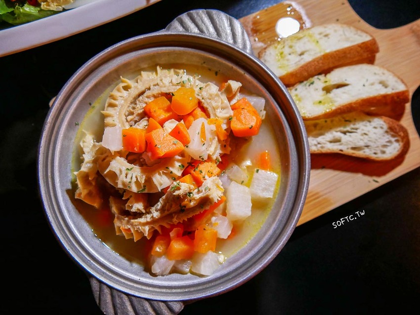 來自羅馬尼亞著名的傳統美食,牛肚加入洋蔥拌炒,隨後與紅蘿蔔、白蘿蔔一起燉煮3小時以上,起鍋前再淋上新鮮檸檬汁。我只能說這道牛肚酸香有勁,牛肚燉煮地相當軟彈,入口酸得提神醒腦,隨後是蘿蔔的細甜撲滿整個口腔,其實老實說跟剛剛希臘的燉牛肉,軟西跟姊妹也覺得很像異國風味濃厚的台式料理,很像高級熱炒店或是家常菜會出現的,只不過又多了許多ABV的小巧思,把地中海的美味料理帶到人客面前。