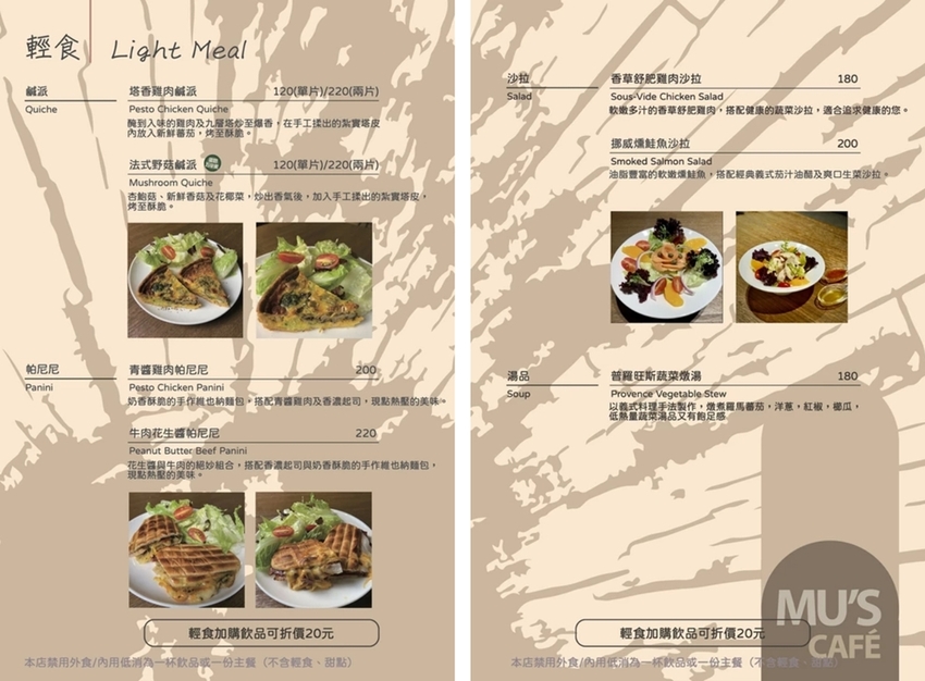位在東門附近的木色藝文咖啡(Mu’s Café)是間結合音樂與咖啡甜點的咖啡店,在店內有不少與音樂相關的裝飾,可以感到文藝氣氛外,在咖啡方面亦引進精品咖啡元老級的湛盧咖啡,部分甜點也與套房裡的甜點師合作,餐點每天純手工製作,讓來的人除了能有舒適的環境外,也能品嘗到美味的餐點。