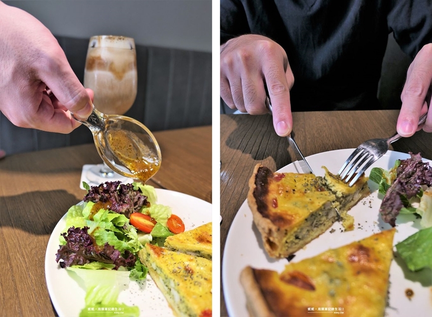 木色藝文咖啡的餐點其實很多樣,除了咖啡與甜點外,也有簡單的餐點像是燉飯、咖哩飯以及鹹派等,尤其炙燒鮭魚青醬燉飯從醬開始就是店家自製,每天開店前都要提早製作,可以說是限量餐點(我就是太晚到了沒緣分吃到嗚嗚嗚),咖啡種類也有義式經典、義式特調、莊園單品以及木色配方豆咖啡等,還有冰釀啤酒及冰沙氣泡飲等,多樣選擇讓我在點飲料的時候還猶豫了好久。(更詳細的菜單可參考官網)