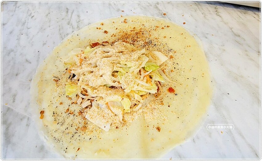 咬上一口滿滿的餡料大爆發,高麗菜、豆芽菜都還保留鮮脆口感、豆干跟花生粉的鹹甜讓滋味很不錯!!