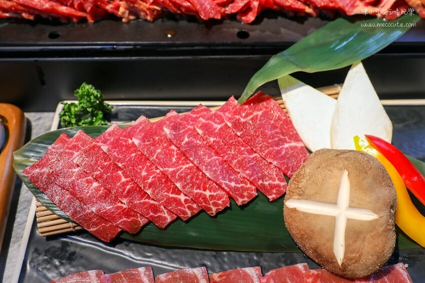燒肉精緻擺盤 霜降翼板牛、嚴選牛五花,一旁還有青椒、杏鮑菇和香菇。