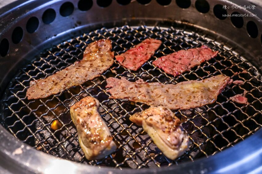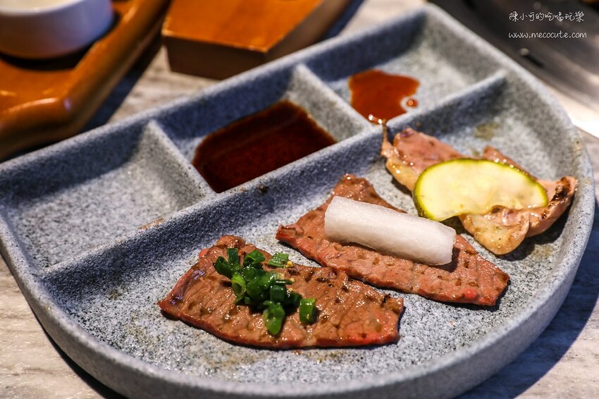 我們烤到七分熟,略帶厚度的鑽切牛是外酥內嫩的口感,單吃原味不沾醬配越光米飯就超好吃,搭配柚子醬多了清爽風味,我也喜歡椒鹽芥末粉,一種燒肉有多種搭配,相當有趣。