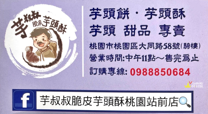 桃園市美食「芋叔叔脆皮芋頭酥」,位於桃園車站旁的銅板美食,芋頭控千萬不能錯過!現點現做的芋頭球有多種口味~都可以依照個人喜好選擇!店家每日換新油~餐點好吃不膩口~拿在手上也沒有油膩感唷!另有奶酪和芋頭牛奶可嚐鮮!是很棒的隨手點心😋文章內有店家地址、電話、營業時間、完整菜單價目表MENU供參考!
