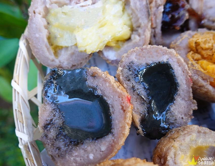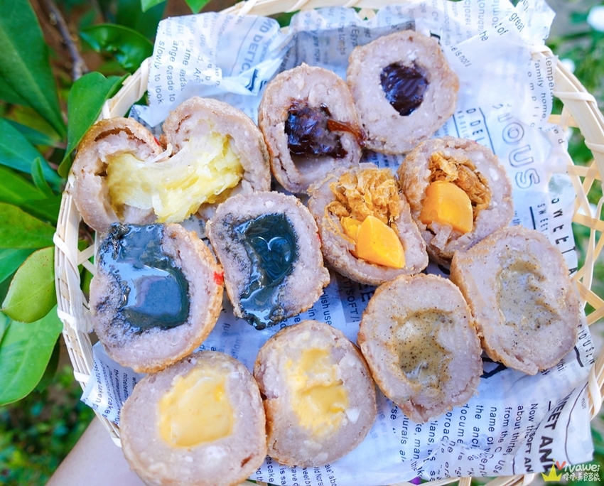 ▲我們這天點了肉鬆蛋黃、爆漿起司、伯爵奶茶、黑芝麻、黑糖麻糬、奶黃共六個口味!我在外面其他攤販只看過原味和肉鬆蛋黃~這還是我第一次看到芋頭球有這麼多口味呢😋