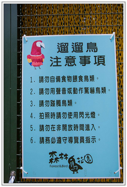 不亂丟棄、不亂餵食、不可攜帶寵物(貓狗或嚇到鳥)。