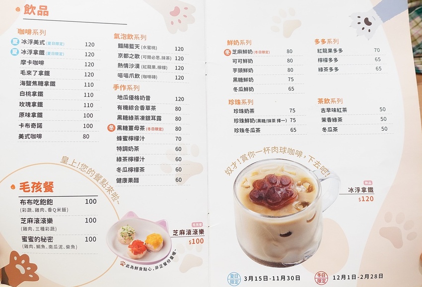 供應餐點有套餐、輕食、兒童餐、點心、飲料及毛孩餐