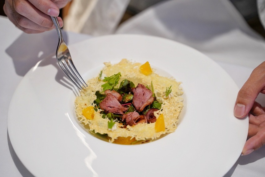 另一道是「綠胡椒燻鴨胸溫沙拉」,上面的炙燒鴨胸圍繞了一圈香脆乳酪餅,底層有芝麻葉,淋上濃郁乳酪醬及酸甜的綠胡椒醬,食用前再把乳酪餅敲脆後拌入其中,這樣吃口感更豐富美味!