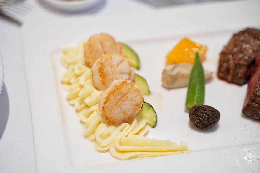 旁邊還有三大顆干貝、馬鈴薯泥以及配菜,吃完相當滿足。