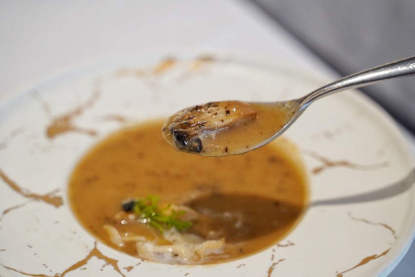 「松露蕈菇濃湯」上桌時會給你一盤加熱過的空盤,裡頭放入烤過的菇類、鮮奶泡及松露,接著服務員會現場淋上深咖啡色的濃湯~