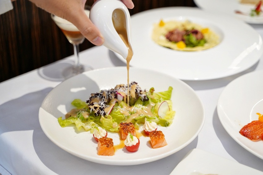 以多種生菜、炙燒鮭魚及乳酪醬番茄組成,食用前再淋上凱薩醬,是道鹹香又清爽開胃沙拉!