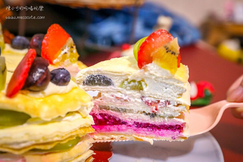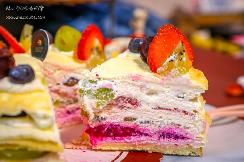 細緻柔滑的餅皮層層堆疊,香氣濃郁,這水果配色讓人看了食慾大開,好吃又好看的口味。