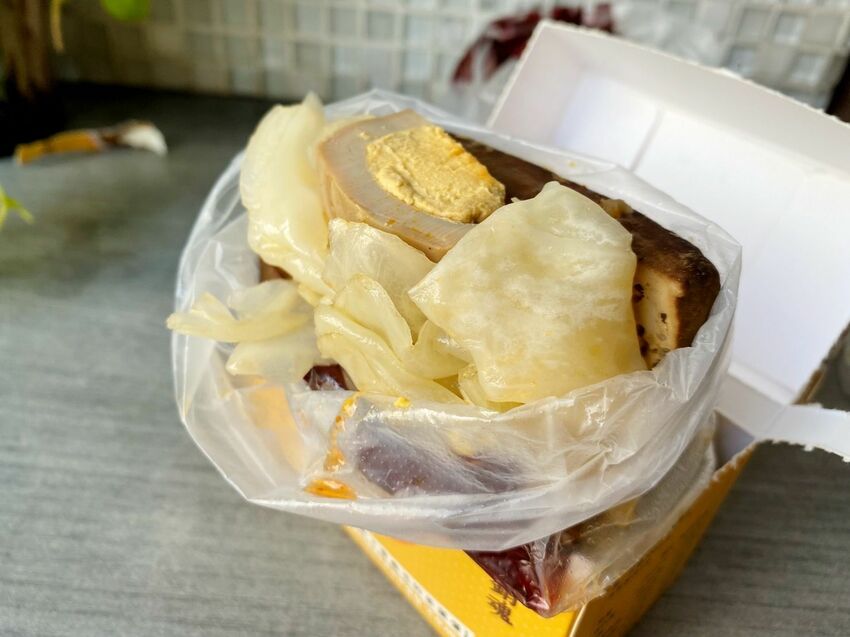 兩片多汁的豆干包裹著泡菜、豬絞肉、配料,還有1/4顆辣味茶葉蛋