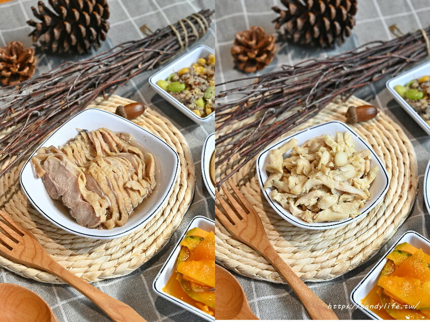 三角厝除了內用餐點外,還有提供外帶防疫餐盒,餐盒內容物除了主餐,還加入了三角厝的招牌小菜,有紅藜毛豆、日式筍片、滷蛋、地瓜及季節時蔬,看起來也相當澎派呢