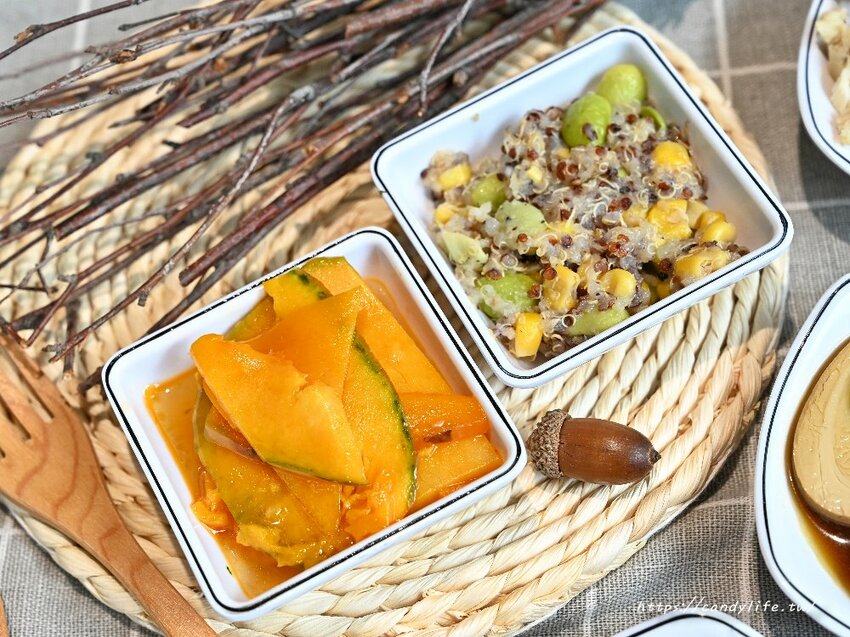 剛開始看到糖醋兩字還以為是一般常見糖醋排骨料理的方式,三角厝的糖醋南瓜使採用台式醃法,採用糖跟醋下去醃製,吃起來酸酸甜甜的,南瓜口感帶點微脆,另外紅藜毛豆裡頭加入了紅藜麥、白藜麥、毛豆及玉米下去涼拌,味道偏清淡,別看他小小一盤,吃完還挺有飽足感的
