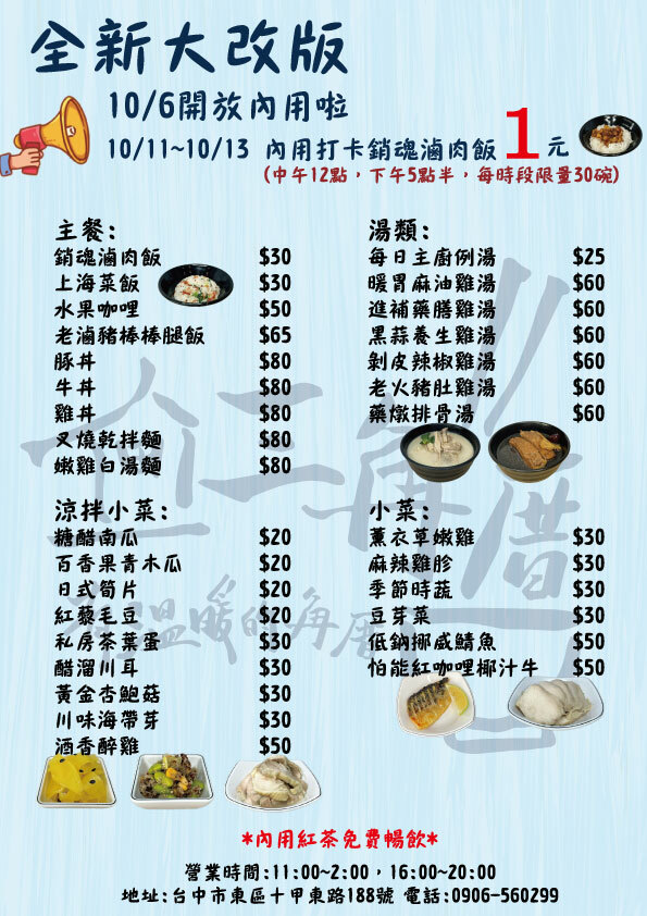 瞧瞧三角厝的菜單就知道價格有多親民,餐點通通都是銅板價,主打台式飯食及麵食,還有各式各樣的涼拌小菜、主廚私房小菜及湯品,品項還蠻多可以選擇,內用還可享紅茶免費暢飲