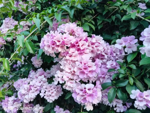 今年楓樹河濱公園蒜香藤花期較去年慢了將近一個月左右