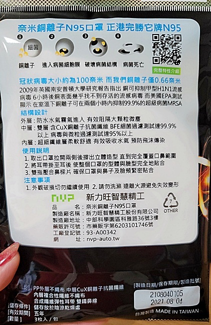 奈米銅離子N95口罩的完整特性介紹,可以掃外包裝上的QR Code來更認識它的優點與特性喔! 外袋上也清楚地將使用說明列出來,該如何佩戴好口罩呢? 1. 取出口罩拉開兩側後撐出立體造型 直到完全覆蓋口鼻範圍,2. 將耳帶掛至耳後 使整個口罩的型體與臉型完全地貼合,3. 雙指壓合鼻樑片 確保口罩與鼻子及臉頰緊密貼合,平均一個口罩平均可戴5-7天、但外觀如有破損就不要再使用了唷!!