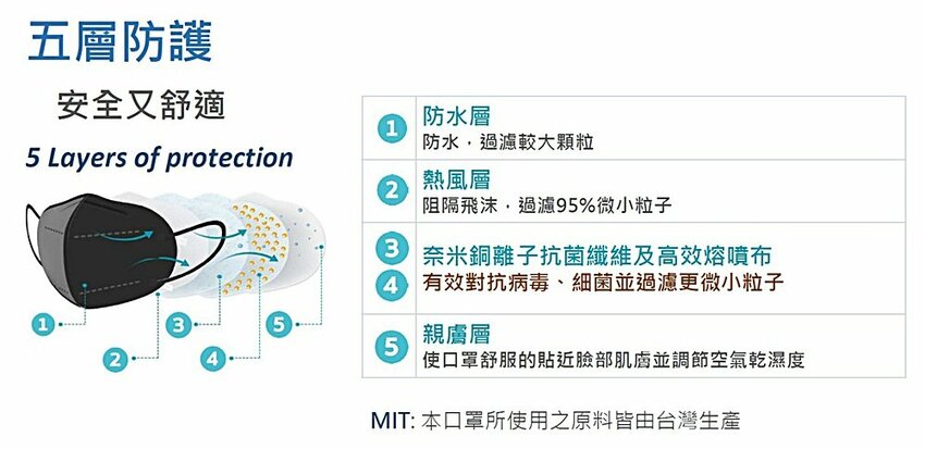 來自台灣製造的奈米銅離子口罩有著五層防護,1防水層,可防水 能過濾較大顆粒,2阻隔飛沫並過濾95%微小粒子,3.4銅離子抗菌纖維結合熔噴布、有效對抗病毒、細菌並過濾更微小的粒子,5有著皇冠級親膚層、使口罩舒服的貼近臉部肌膚並調節空氣乾濕度。