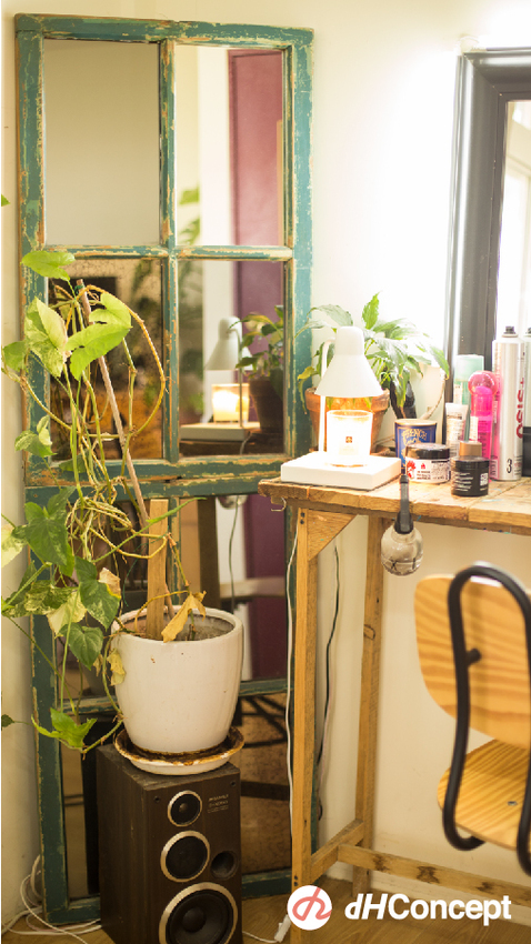 在化妝檯旁邊的「窗戶鏡子」絕對是家中亮點之一,Henry介紹那本來是三面很老的窗戶,他將其中的兩面拼在一起,把原本的玻璃換成鏡子,就成為了獨一無二的擺飾,其實很多物品,只要小小的改變,就可以賦予它新的生命,Henry特別分享,為了讓窗框看起來更有層次及特色,他用砂紙打磨讓整體更有復古老物件的感覺。