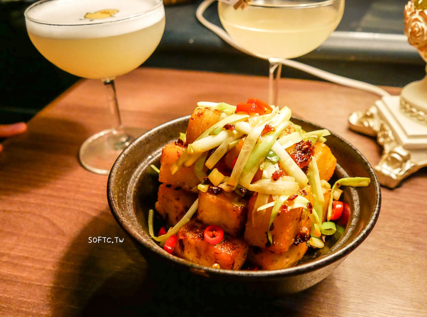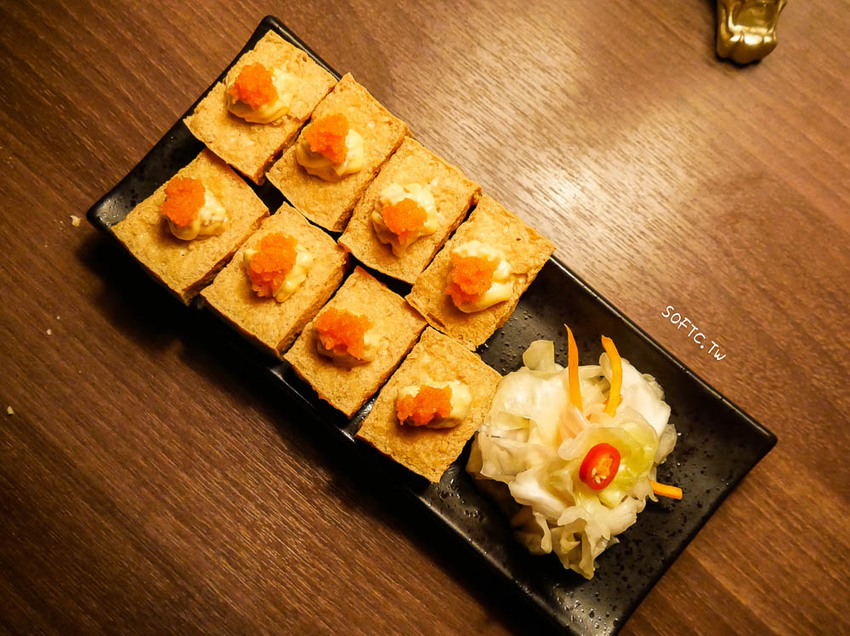 明太子跟特調美乃滋醬,感受到豆腐皮咖滋咖滋在嘴裡脆香之餘,明太子的鹹度和辣感緩緩與豆腐融合,吞入喉後還有鹹香留在唇齒,不太吃豆腐的姐妹忍不住夾了好幾塊,Book ing bar不僅調酒厲害,餐點也毫不馬虎耶!