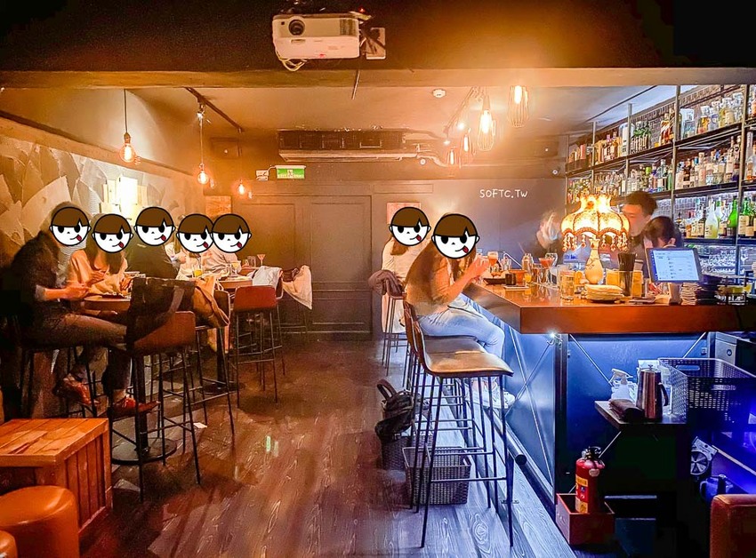 書櫃在身後碰得關上那瞬間,原本置身夜晚靜謐台北巷弄中的我們,瞬間移動來到人聲鼎沸的熱鬧酒吧,有酒杯碰撞的清脆聲響、有笑鬧喧騰的聊天聲、有服務生熱情的招呼聲,即便是星期天晚上店裡依舊是9成滿,昏黃燈光下想離開還無法轉身就走,至於出口在哪邊,就留給軟絲們自己來探索吧,不過我想沒喝個三五杯,服務生應該不會輕易放人出去(開玩笑的)。