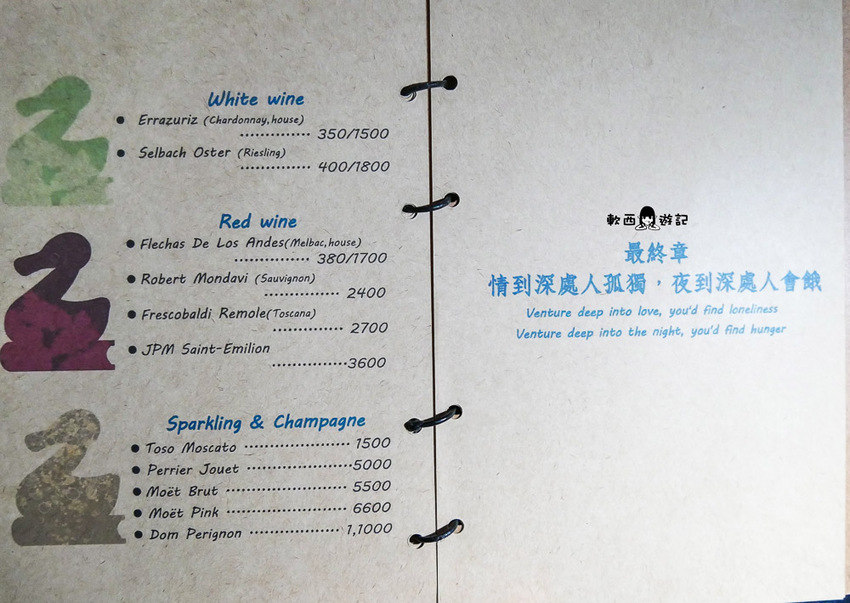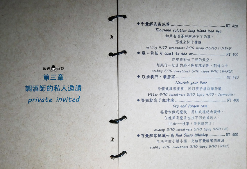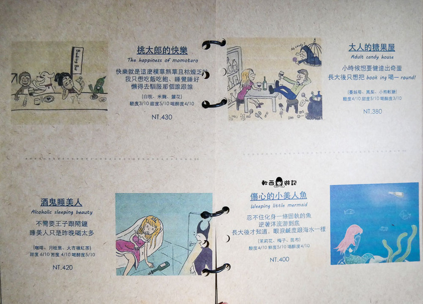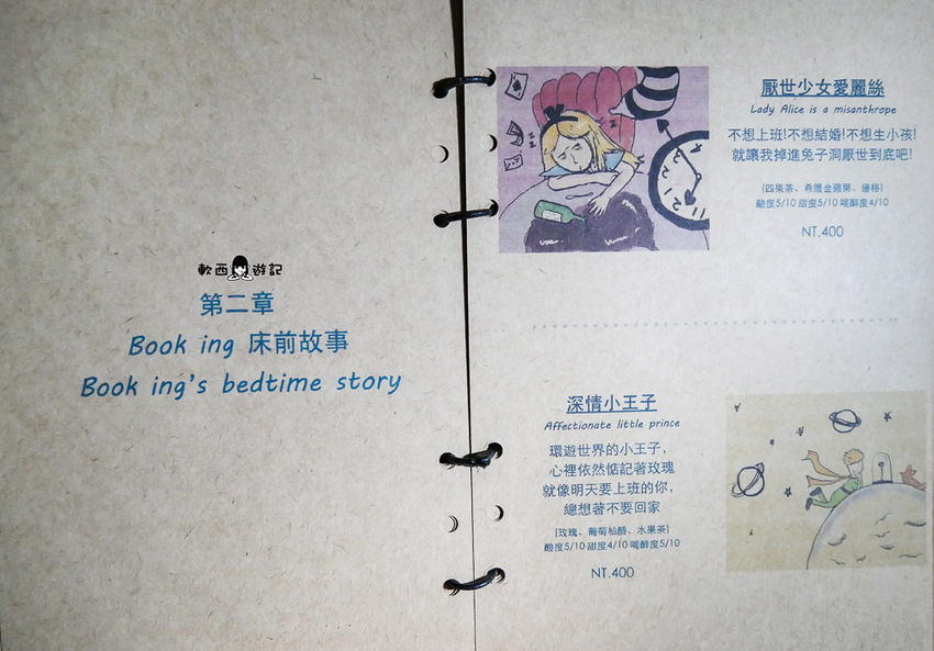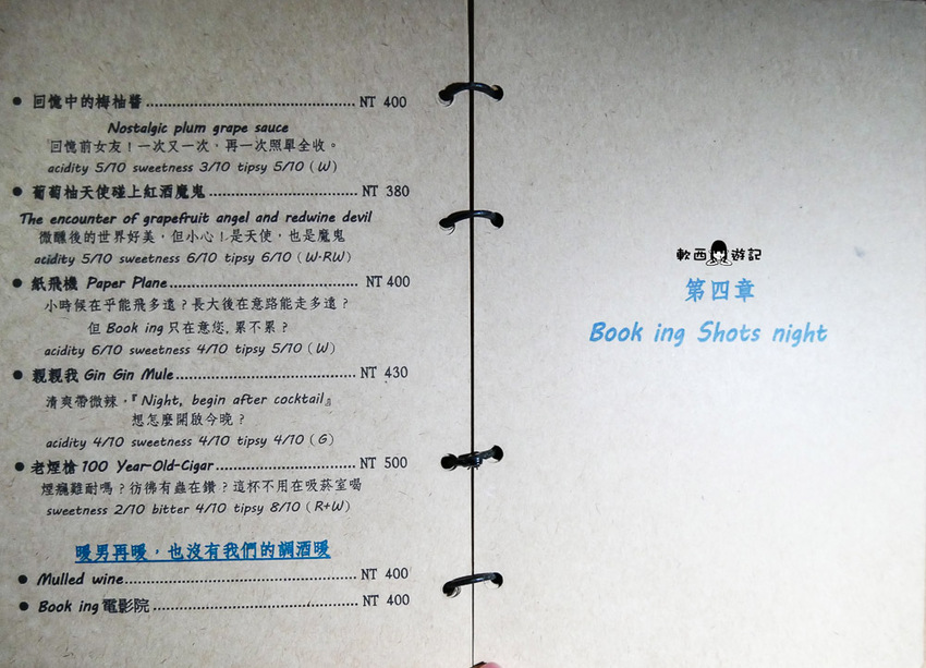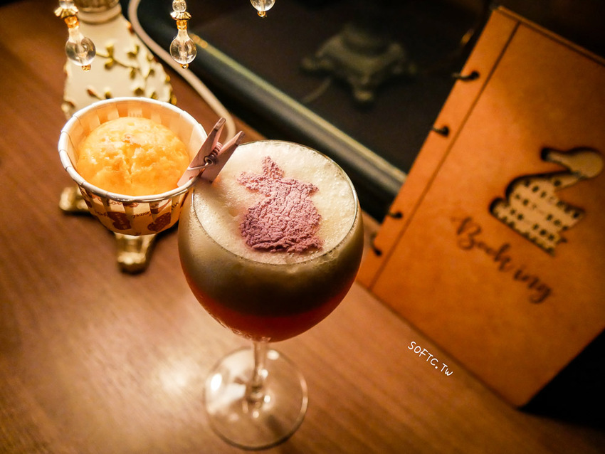 以萊姆酒為基底,加入咖啡、月桂葉、大吉嶺紅茶,上面的ZZZ是粉打上去的,老實說喝到這邊軟西已經有點頭昏眼花,都喝到這了就讓大家當酒鬼睡美人,醉倒在Book ing Bar的童話世界裡吧!