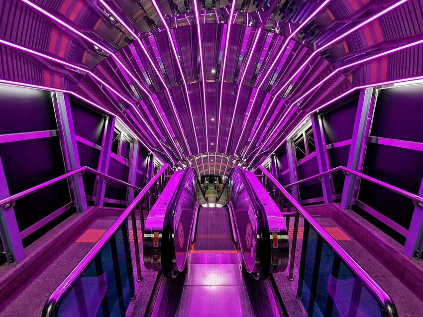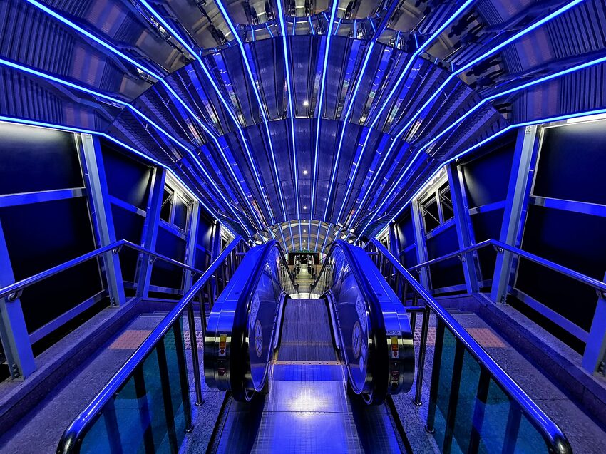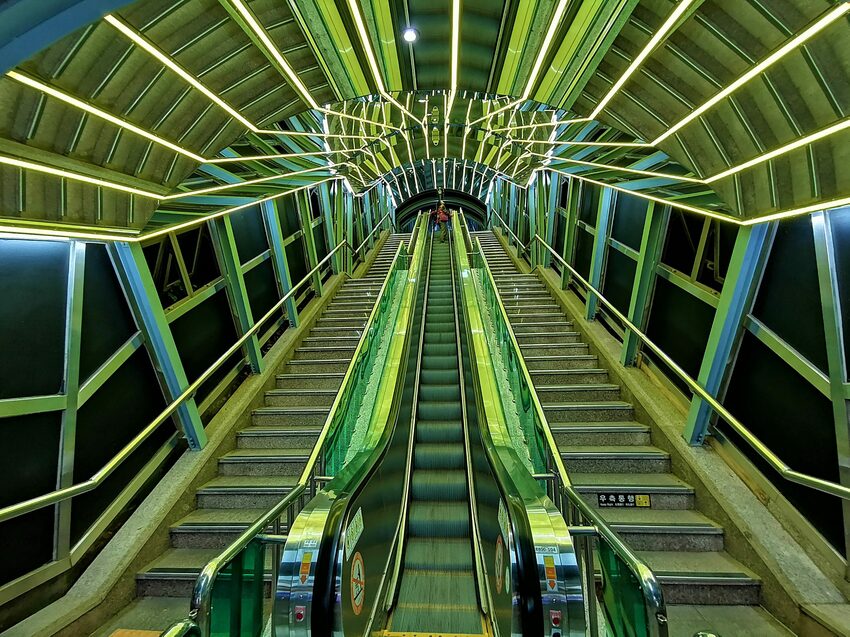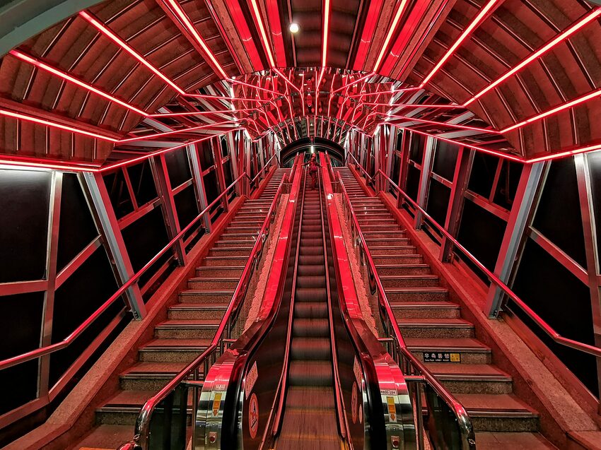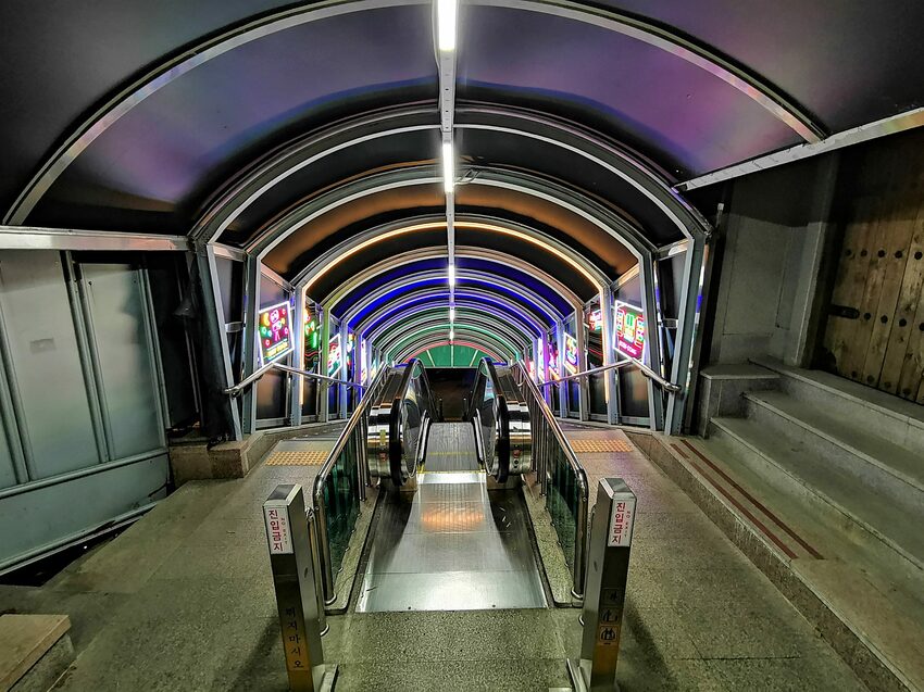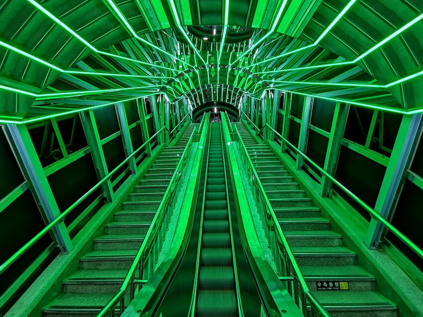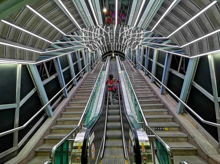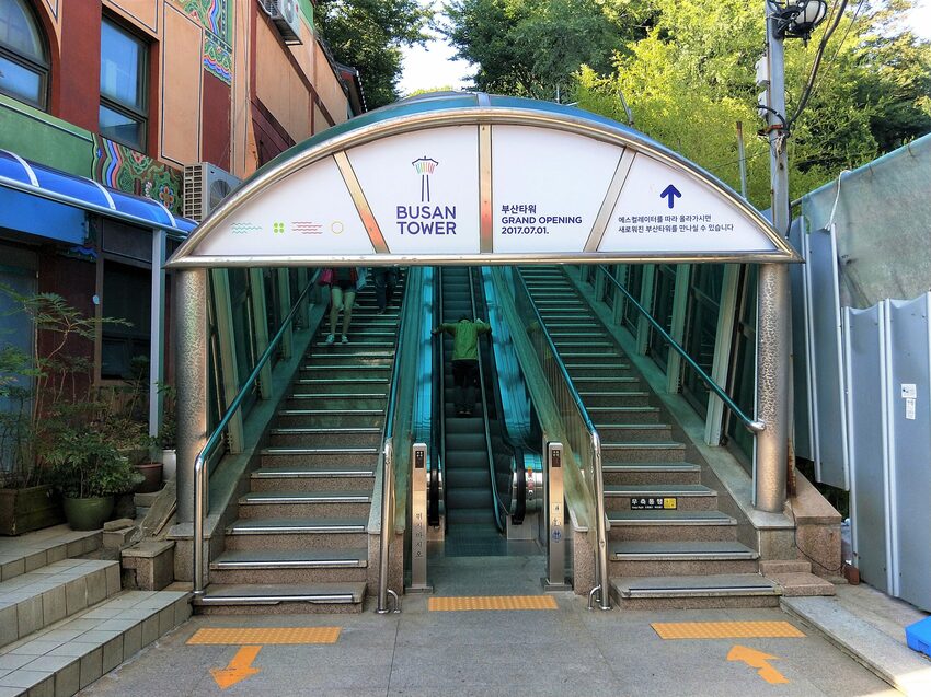 釜山的龍頭山公園용두산공원(Yongdusan Park),是釜山市區內高度約有49公尺的丘陵地,因山勢就像出海蛟龍的龍頭而得名,電梯入口就在熱鬧繁華的商店街光復路上,晚上時隨著多段的手扶梯上樓,兩側超炫LED燈光秀,還有顏色隨時變換的藝術燈,讓旅人搭電梯不會覺得腿痠,還能欣賞創意的燈光藝廊展示,從公園內還能順便登上白色的釜山塔(BUSAN TOWER),踩點台灣電視劇>的拍攝景點,俯瞰釜山港與影島美麗的夜景
