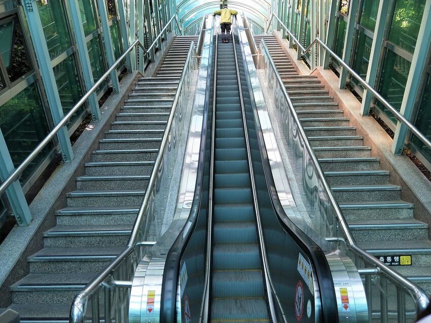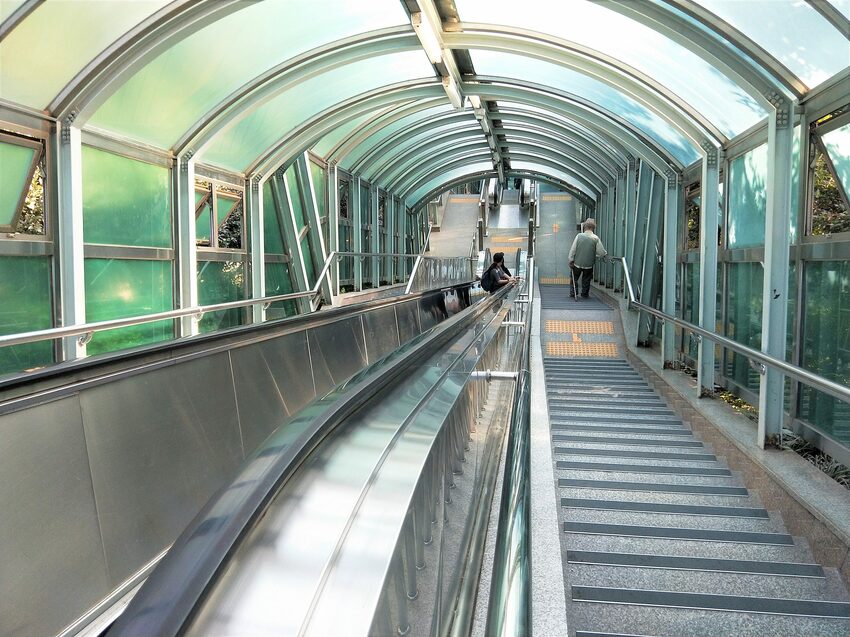 手扶梯寬度窄窄的,僅能容納一個人通過,若要叉身而過,可能就要上演摸乳梯了,而且電梯只有向上,沒有向下,所以等等要下山時,要自行慢慢走下樓,至少不用費力爬坡上山啦(這裡要帶著嬰兒車比較不方便上手扶梯,跟扛著下樓梯,有帶嬰兒來此一遊,最好跟我們一樣用背帶抱著,比較方便行動)