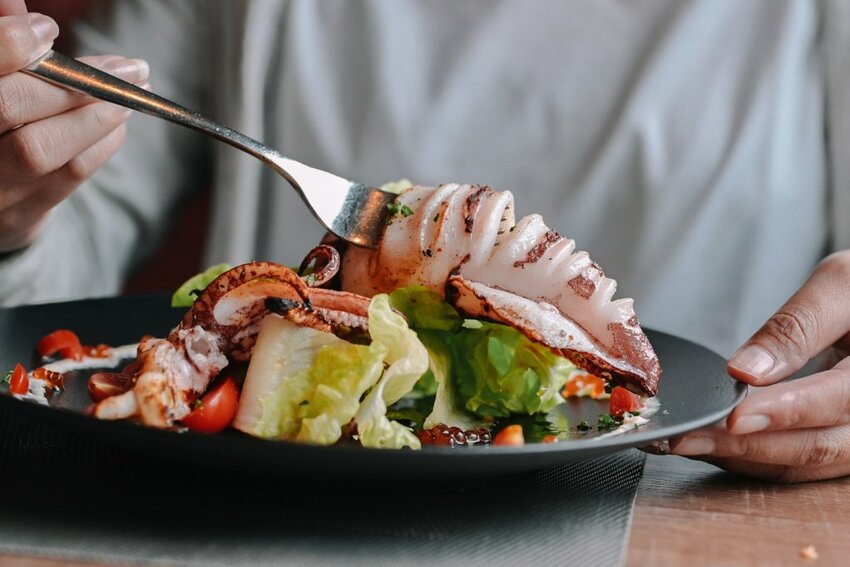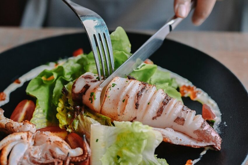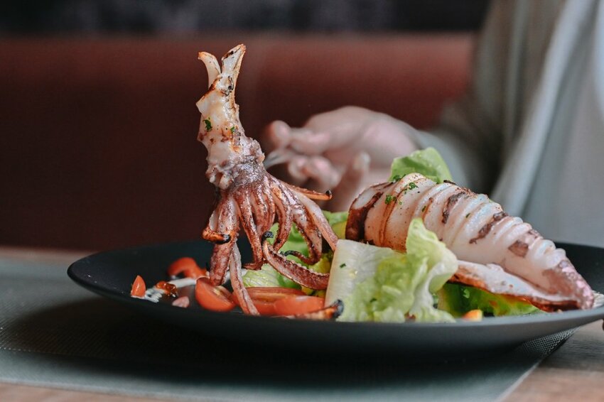 一整尾碳烤過的的透抽擺放在生菜沙拉上霸氣十足,內有蕃茄丁,鮭魚卵,醃黃瓜,水煮蛋,烏魚子碎,風味蒜蓉辣醬等,擺盤好加分。