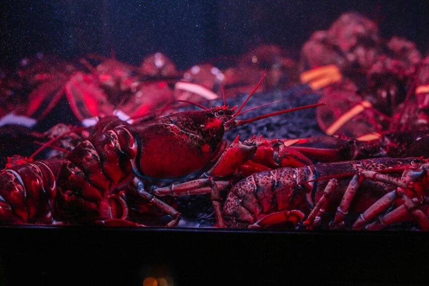 水族箱內有新鮮的波士頓大龍蝦,現在有辦活動,買半尾送半尾,買一尾送一尾,超划算!