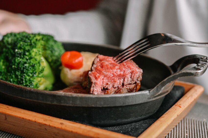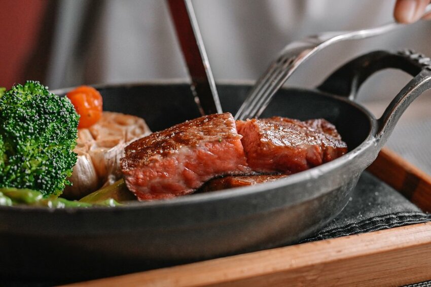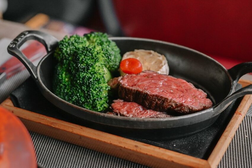 內有主菜M9澳洲和牛紐約客牛排與配菜烤大蒜、青花椰菜、醃製小番茄以及烤美國蘆筍。