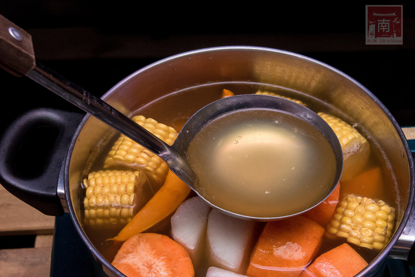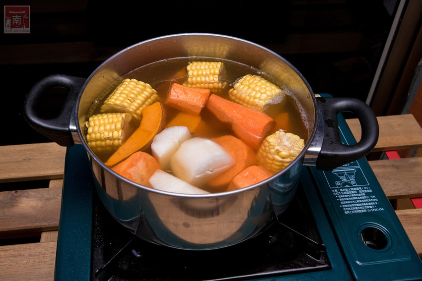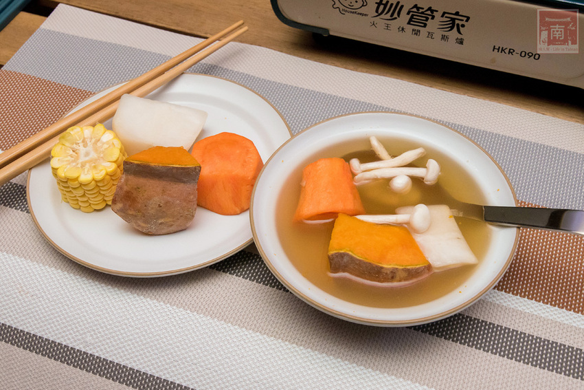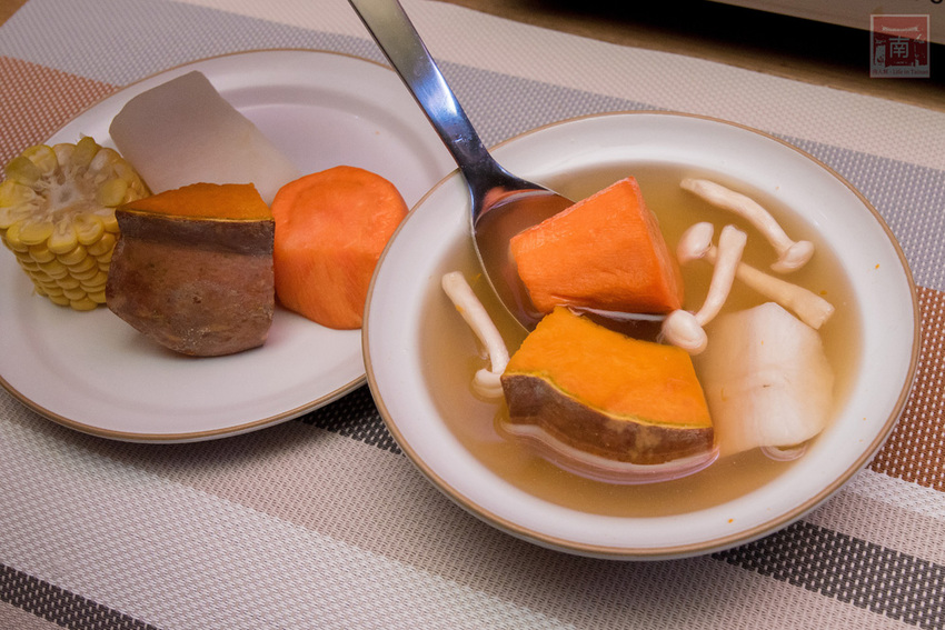 小編覺得『百蔬鮮果養身鍋』適合當消夜,因為湯底本身就加了蓮藕、山藥、蘋果、昆布、蘿蔔、玉米等食材熬煮,本身就有蔬果的鮮甜味,100%無人工添加物。自己再加入南瓜、紅蘿蔔、白蘿蔔、蔬菜等食材煮一煮,就變成了健康又低負擔的消夜,湯頭清淡甘甜,小編自己添加的食材喜歡切大塊的,可以大塊大塊吃,睡前來個熱熱的好溫暖,而且吃素的朋友也可以喝喔!