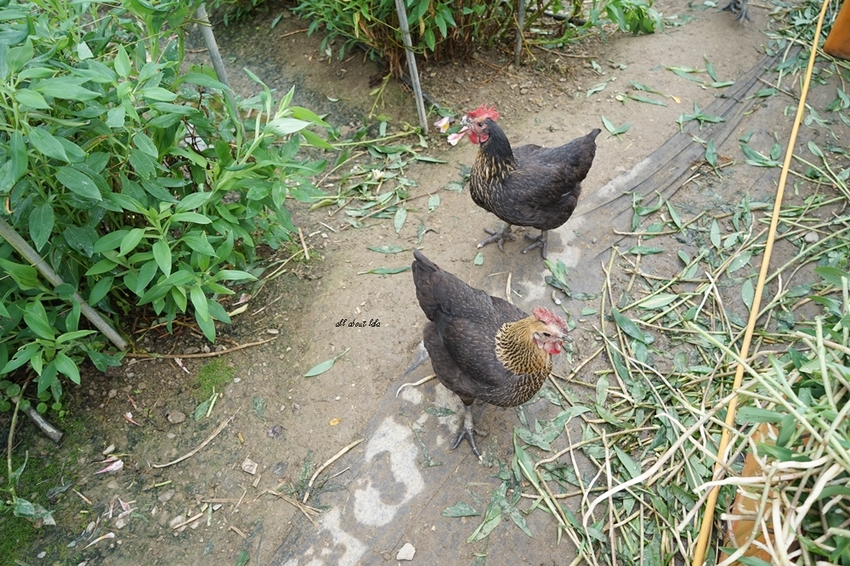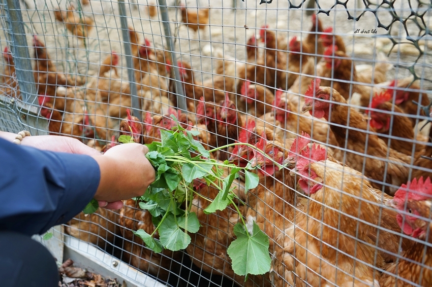 只見解說員隨意在地上抓了些野草(冬寒菜)湊過去,那生蛋的雞隻就全湊過來瘋狂搶食,也太有趣了。
