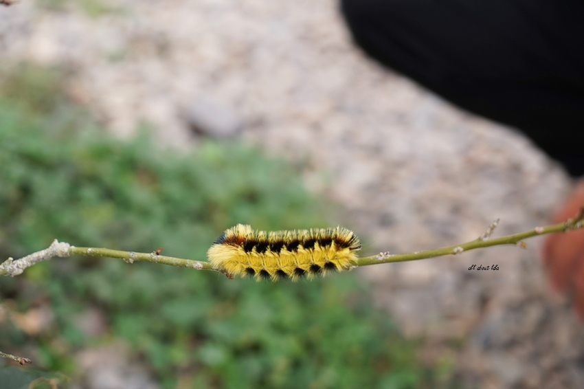 褐帶蛾的毛毛蟲防衛姿態也很奇妙,輕輕一碰就像我家貓咪生氣炸毛一般,全部毛都豎起。