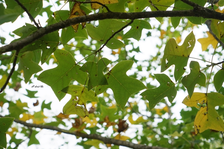 馬褂木的樹葉可以拿來做衣裳,借位拍出可愛的稻草人樣貌。