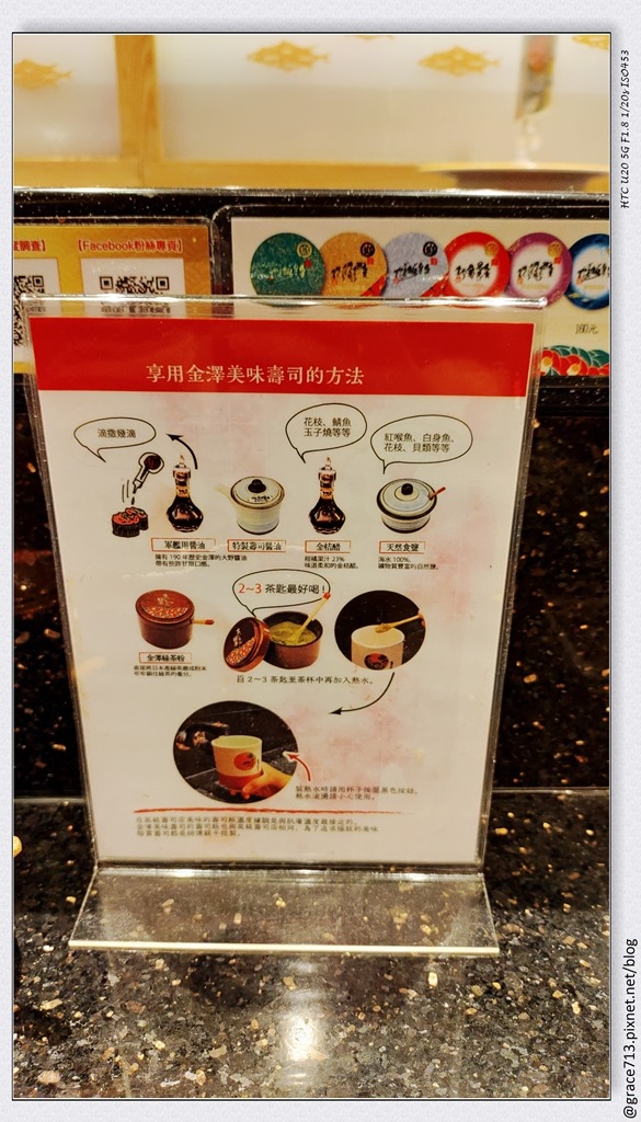 前面有好幾種醬油, 還有牌子說明不同壽司使用不用醬料等