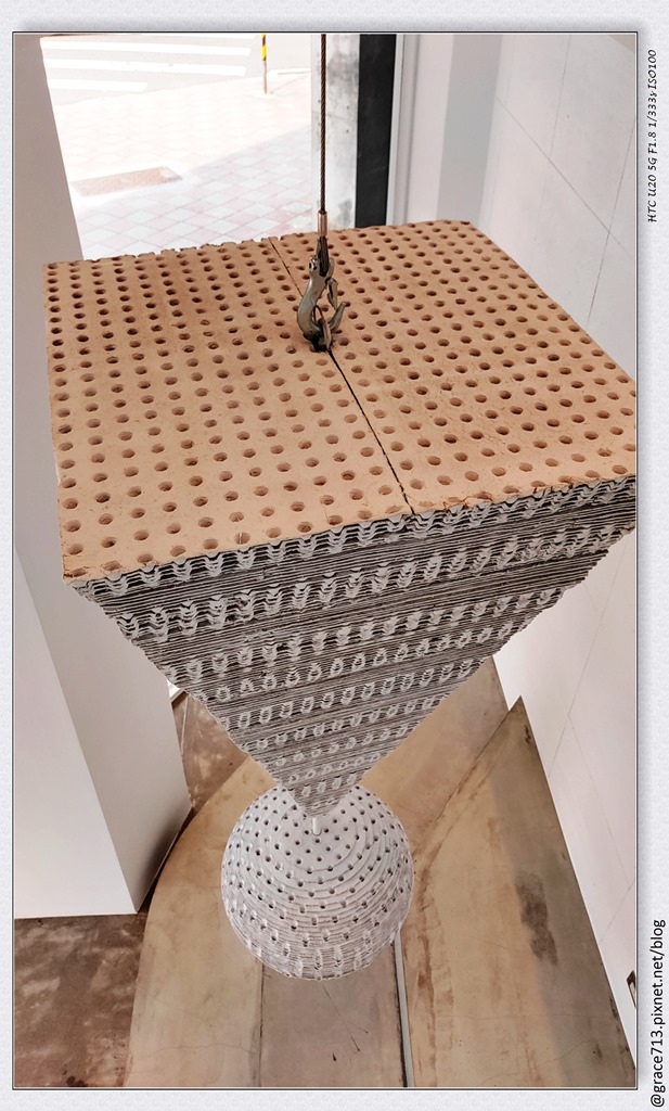以外帶紙杯架砌形塑成的兩公尺巨大立體驚嘆號,垂吊天井、挺立於民權與中山北十字路口,是此旗艦店最重要的標地。