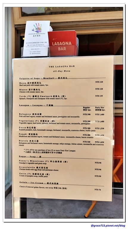 菜單是夾在牆上, 自取下來看. 千層麵價格從 280- 320 之間, 第一次來當然要點經典肉醬, 另一份我選了雞肉蕈菇, 其實也有考慮要點很受歡迎的青醬蔬食, 素的千層麵確實不常見, 還有湯等..這裡有不少蔬食選擇, 但我們二個都想吃有肉的口味, 所以下次再來點