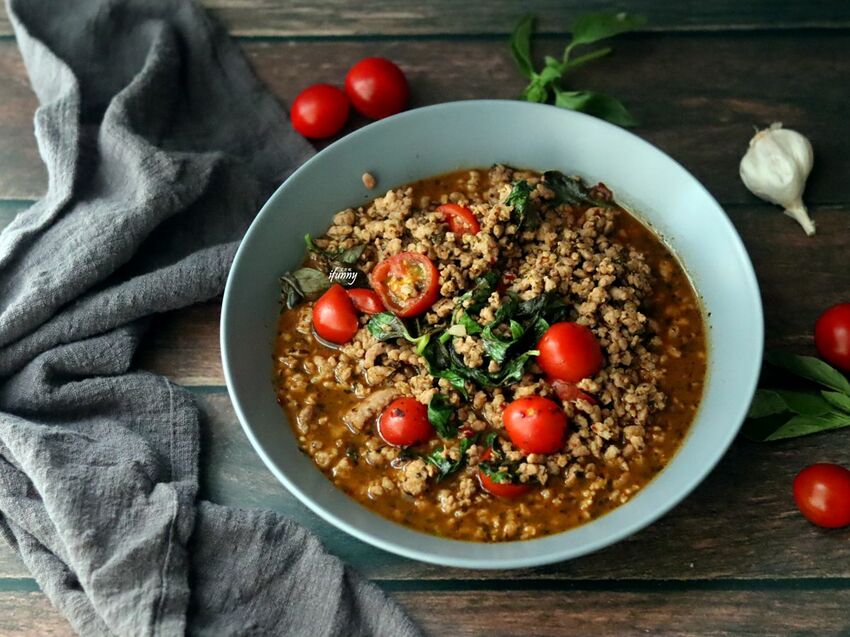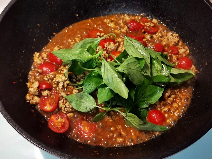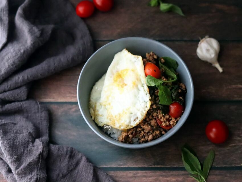 滑嫩的豬絞肉加上打拋醬微辣口感,並帶點微酸香味與九層塔獨有香氣結合,是一道非常下飯且適合夏天的泰式料理。