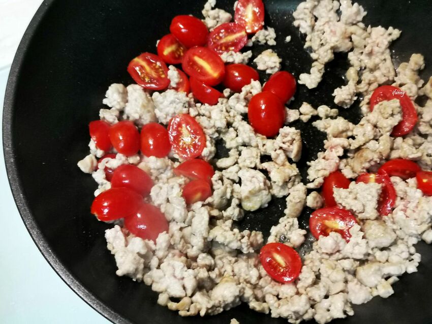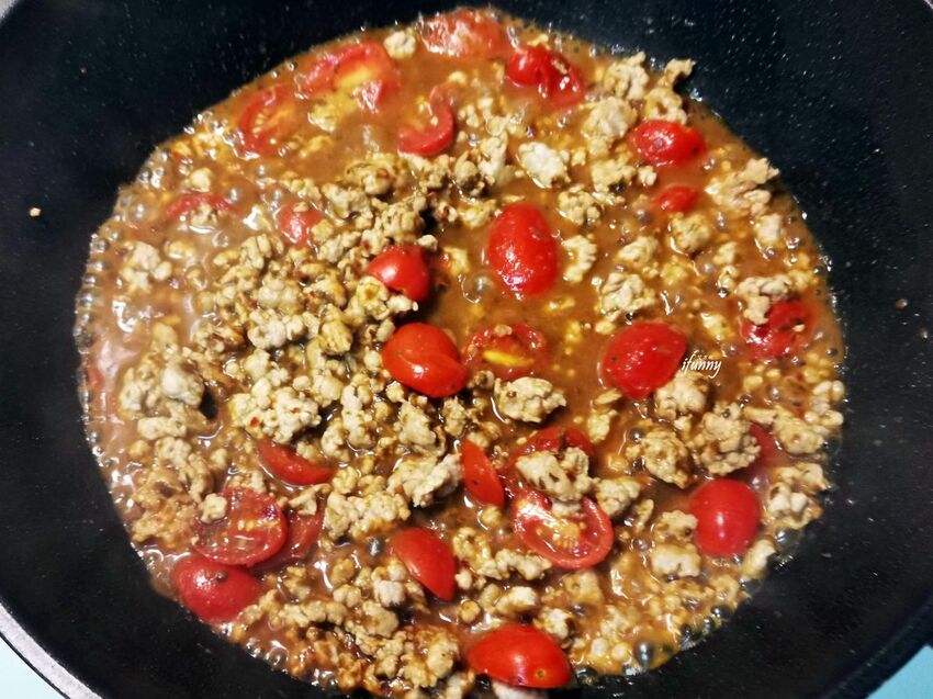 然後再另外加水煮開食材,也方便醬料與絞肉結合入味。若喜愛醬汁多一些的方便拌飯,可以多加點水。