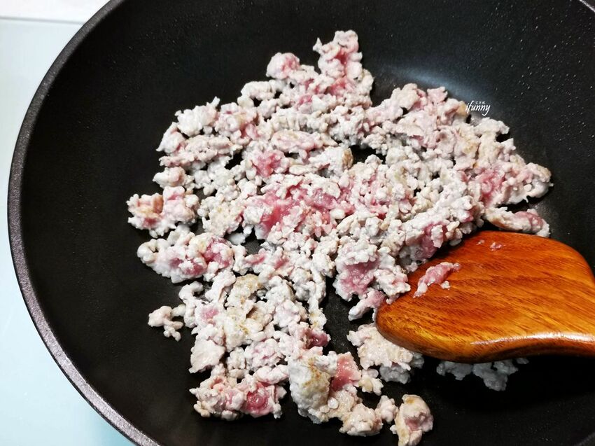 習慣用不沾鍋,其實起油鍋後可以先煎荷包蛋,煎好後再放少許的油,將豬絞肉炒至變色。