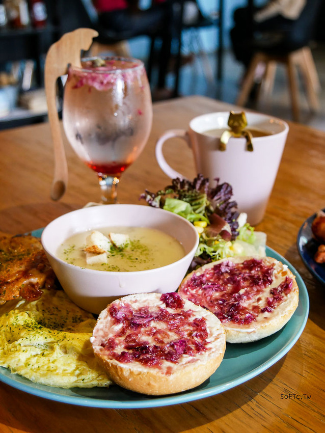 漫漫花時間的招牌餐點之一,軟西最喜歡的就是那個自製新鮮玫瑰醬,下面搭配有點像優格的醬,吃起來酸酸甜甜,麵包帶點嚼勁,邊嚼淡雅玫瑰花香氣在口中盈香,旁邊雞腿排也不遑多讓,皮微微脆口,蛋也相當嫩,整體來說不是只有美貌,是能有飽足感的早午餐。