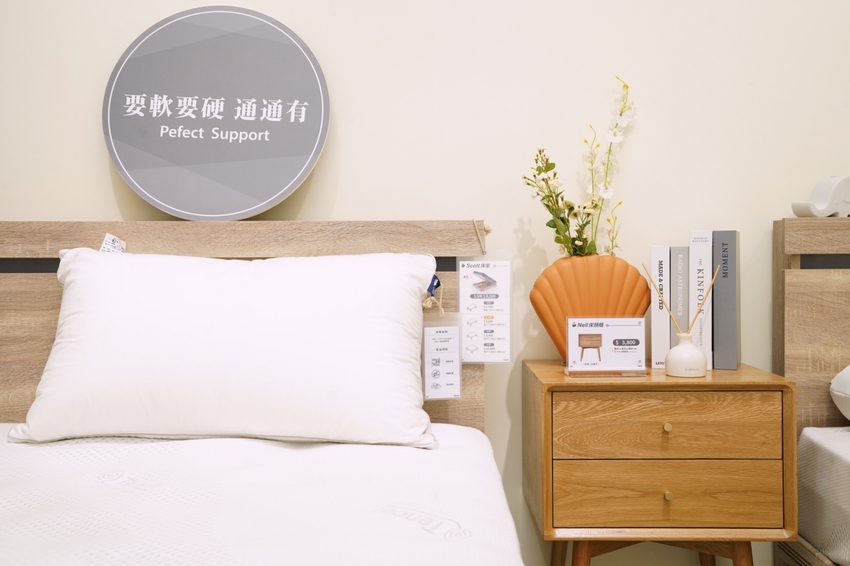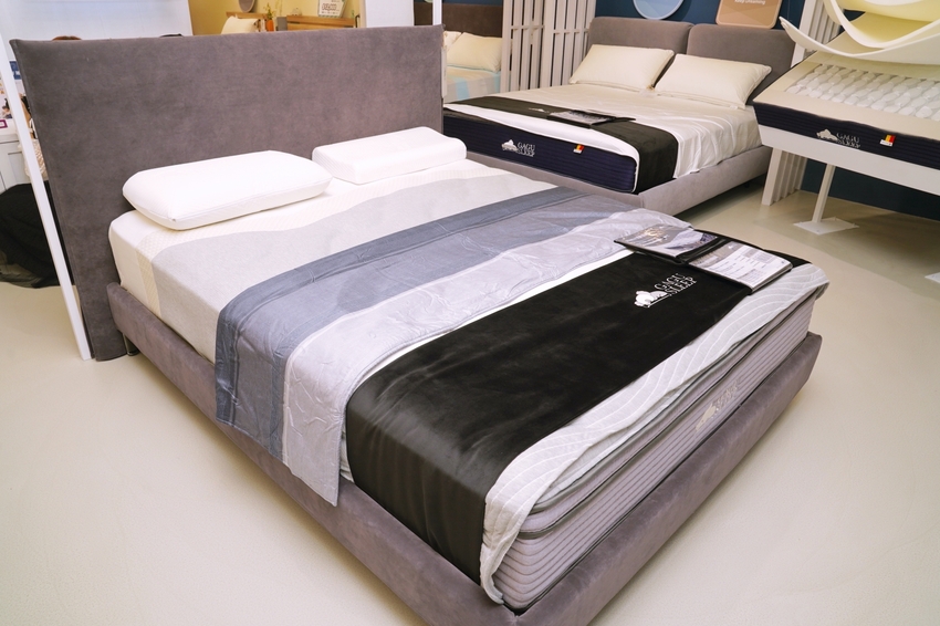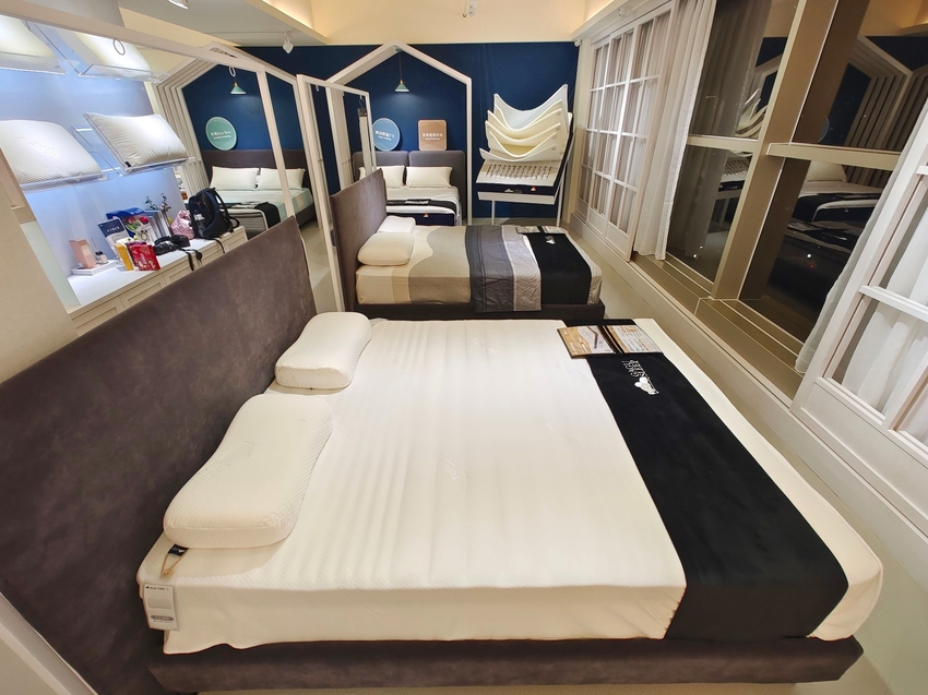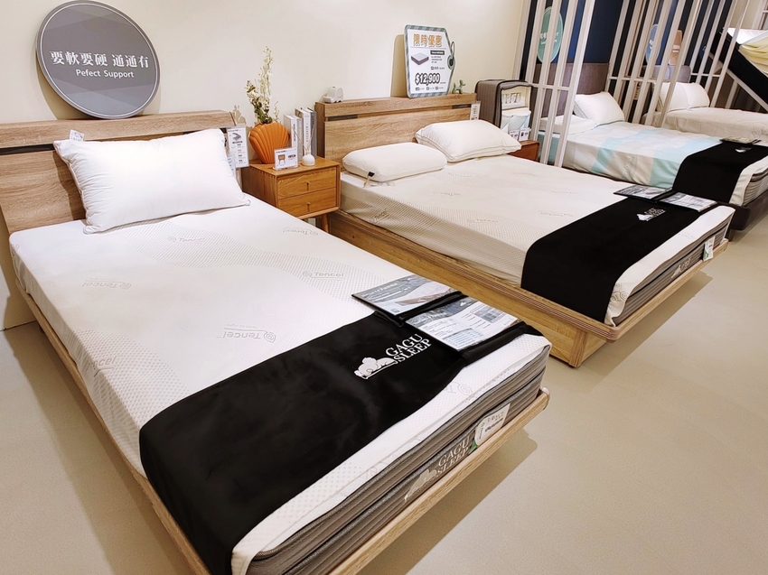 ▼最左邊的單人床是偏硬的天絲舒眠床,由於天絲舒眠床售價不會太高,又具備大眾很需要的吸濕性、抗菌防螨等特點,是暢銷的國民款床墊。