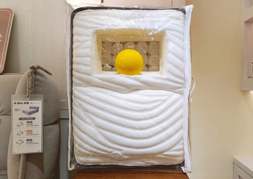 ▼現場有展售睡感「適中」、「偏硬」兩種軟硬度的 HoKum 3.0 天絲舒眠床床墊,目前正在優惠特賣。Daphne 偏愛照片中這張睡感適中的床墊,軟一點特別能感受到與皮膚接觸的細膩觸感。